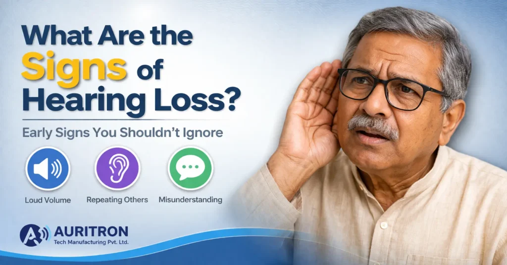Blog Book An Appointment What Are the Signs of Hearing Loss? Many people do not notice hearing loss right away because it usually happens slowly over time. That’s why a very common question is: What are the signs of hearing loss? Hearing loss does not always mean complete silence. It often begins with small, everyday problems like missing words, struggling in noisy places, or turning up the TV volume. This blog explains the early warning signs, stages, causes, and solutions in simple, easy-to-understand language. What Are the Early Warning Signs of Hearing Loss? Early signs are often ignored because they seem normal at first. Many people think others are speaking unclearly, but the real issue may be hearing clarity. Common Early Warning Signs In the early stage, hearing changes are subtle but noticeable in daily life. You may experience: Asking people to repeat themselves more often Difficulty hearing clearly in noisy places like restaurants or markets Increasing TV or phone volume higher than others prefer Missing soft sounds such as doorbells, alarms, or whispers Noticing these signs early makes it easier to protect hearing before it worsens. What Are the First Stages of Hearing Loss? The first stage of hearing loss is usually mild hearing loss. At this stage, people can still hear speech but may miss important sound details. What Happens in the First Stage During the first stage of hearing loss: Speech sounds may feel unclear or muffled High-pitched sounds are harder to hear Conversations in noisy environments become tiring You may hear people talking but miss parts of words Early testing at this stage helps prevent further hearing decline. How Do I Know If I’m Losing My Hearing? Many people are unsure if their hearing has changed because the process is gradual. Paying attention to daily listening struggles can help. Signs You Might Be Losing Your Hearing You may be experiencing hearing loss if: Conversations leave you feeling tired or stressed You avoid group discussions or meetings You misunderstand words often Phone calls feel harder than before If these problems happen regularly, it’s a good idea to get your hearing tested. What Are Three Warning Signs of Hearing Loss? Some signs are stronger indicators and should never be ignored. Three Clear Warning Signs The three most common warning signs are: Difficulty understanding speech in noisy environments Frequently asking people to repeat what they said Increasing the volume on TVs, phones, or music devices If you notice all three, professional hearing evaluation is recommended. What Age Does Hearing Loss Start? Hearing loss does not affect only older adults. It can begin much earlier than many people expect. Age-Related Hearing Loss Hearing loss may start: As early as the 30s or 40s Gradually increasing with age Becoming more common after 60 Loud noise exposure, headphone use, and health conditions can cause hearing loss at younger ages. What Is the Most Common Cause of Hearing Loss? There are many causes of hearing loss, but some are more common than others. Common Causes of Hearing Loss The most common causes include: Natural ageing of the inner ear Long-term exposure to loud noise Ear infections or wax buildup Certain medications that affect hearing Noise-induced hearing loss is especially common today due to loud music and noisy environments. What Are the Symptoms of Sudden Hearing Loss? Sudden hearing loss happens quickly and is considered a medical emergency. Symptoms of Sudden Hearing Loss Symptoms may include: Sudden loss of hearing in one or both ears Ringing or buzzing sounds (tinnitus) Feeling of pressure or fullness in the ear Dizziness or balance problems Immediate medical care can sometimes restore hearing if treatment begins early. What to Do for Mild Hearing Loss? Mild hearing loss should never be ignored, even if daily life feels manageable. Steps to Take for Mild Hearing Loss If hearing loss is mild: Get a professional hearing test Avoid loud environments when possible Use ear protection in noisy places Consider hearing aids if recommended Early action helps slow down further hearing damage. How Can a Doctor Tell If You Have Hearing Loss? Doctors and hearing specialists use safe and painless tests to check hearing ability. Hearing Tests Used by Doctors A doctor may perform: Basic hearing screening Audiometry tests to measure sound levels Speech understanding tests These tests help identify the type and level of hearing loss accurately. How to Overcome Hearing Loss? While some hearing loss cannot be reversed, it can be managed effectively with the right support. Ways to Overcome Hearing Loss Common management options include: Hearing aids Communication training Hearing therapy Assistive listening devices Modern hearing technology allows people to stay active, social, and confident. How Do the Signs of Hearing Loss Affect Daily Life? Understanding what are the signs of hearing loss is important because these signs affect more than just hearing. People may begin avoiding conversations, feel frustrated, or lose confidence in social situations. Children may struggle in school, and adults may find work meetings stressful. Recognising hearing loss early helps maintain relationships, emotional well-being, and overall quality of life. Why Choose Auritron Hearing Aids? At Auritron Tech, we believe that everyone deserves the joy of hearing, and it begins with quality. As a trusted name in the hearing care industry, Auritron delivers high-quality, innovative hearing aid machines backed by years of research and advanced technology. Our dedicated team ensures every product meets the highest standards of comfort, performance, and reliability. Proudly serving people across India, Auritron focuses on making hearing solutions accessible, affordable, and life-changing, improving communication one clear sound at a time. Conclusion Knowing what are the signs of hearing loss helps you take action before hearing problems interfere w